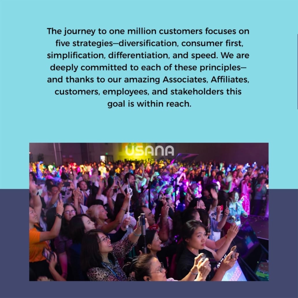 To read more about USANA’s accolades, visit the newsroom on USANA.com. One overarching goal we’ve set for ourselves as a company is to reach 1 million customers. And with your support, I’m confident we can soar past that number.