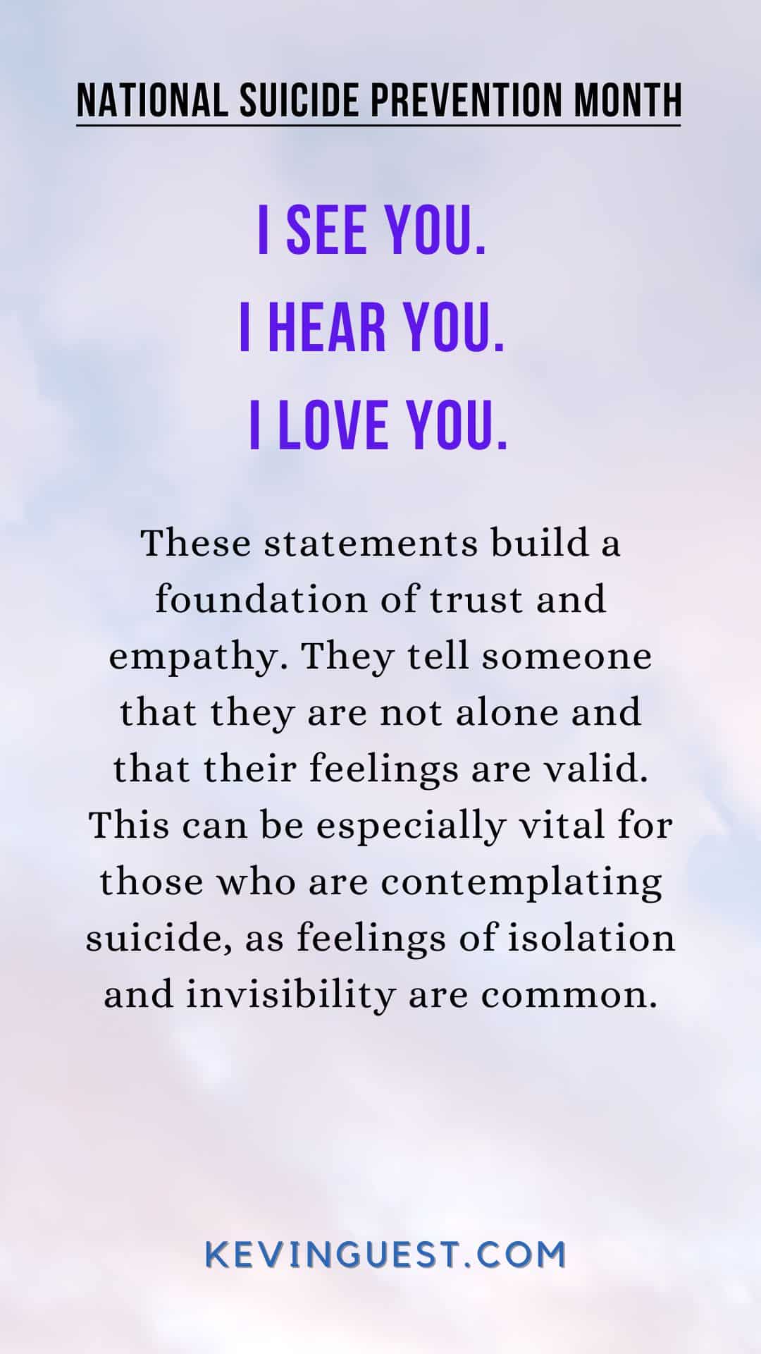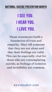 The statements “I see you. I hear you. I love you.” build a foundation of trust and empathy. They tell someone that they are not alone and that their feelings are valid. This can be especially vital for those who are contemplating suicide, as feelings of isolation and invisibility are common.